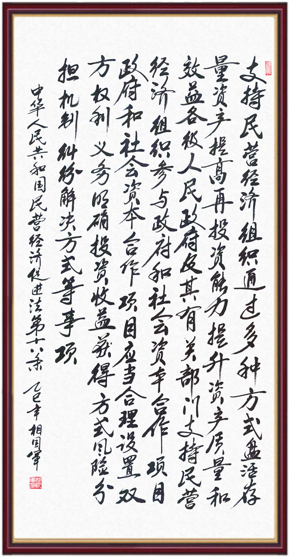 《中華人民共和國民營經(jīng)濟(jì)促進(jìn)法》自今年5月20日起施行。作為我國首部專門關(guān)于民營經(jīng)濟(jì)發(fā)展的基礎(chǔ)性法律,民營經(jīng)濟(jì)促進(jìn)法將支持和保障民營經(jīng)濟(jì)發(fā)展的法律制度融入中國特色社會主義法律體系,具有重大的法治意義,為促進(jìn)民營經(jīng)濟(jì)持續(xù)、健康、高質(zhì)量發(fā)展提供了堅實的法治保障。為更好地學(xué)習(xí)、宣傳、貫徹這部法律,法治日報社聯(lián)合司法部普法與依法治理局,開展“‘書·法’系列活動之書寫《中華人民共和國民營經(jīng)濟(jì)促進(jìn)法》”活動。
