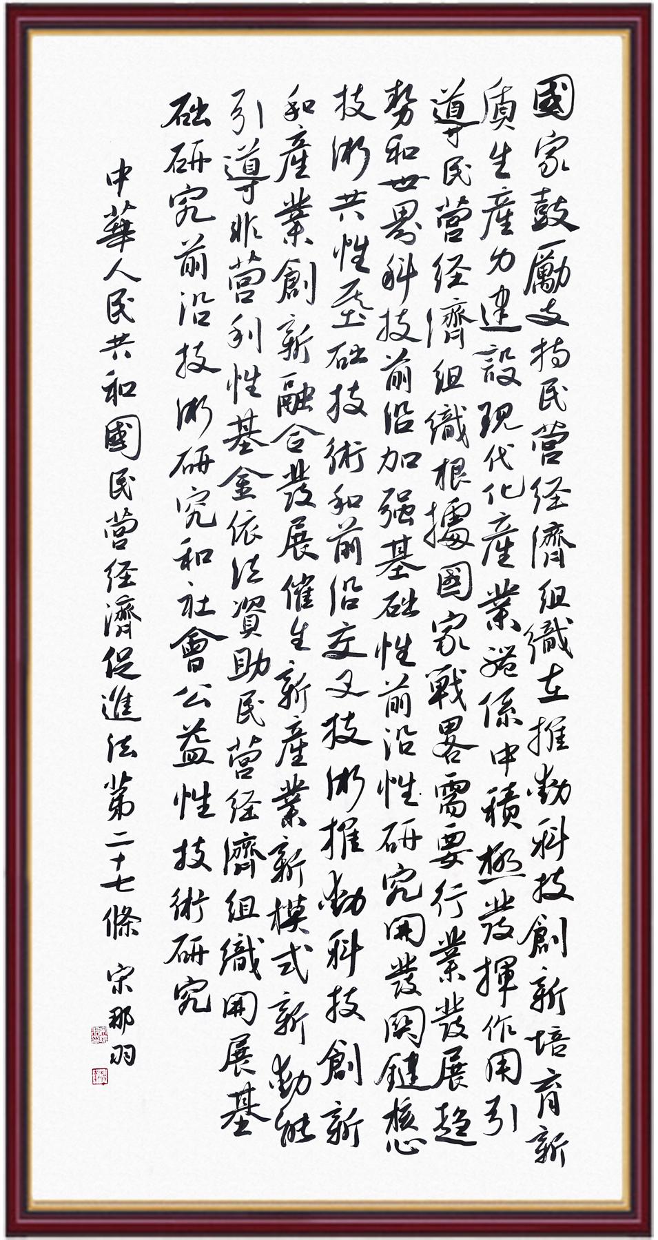 《中華人民共和國民營經(jīng)濟(jì)促進(jìn)法》自今年5月20日起施行。作為我國首部專門關(guān)于民營經(jīng)濟(jì)發(fā)展的基礎(chǔ)性法律,民營經(jīng)濟(jì)促進(jìn)法將支持和保障民營經(jīng)濟(jì)發(fā)展的法律制度融入中國特色社會(huì)主義法律體系,具有重大的法治意義,為促進(jìn)民營經(jīng)濟(jì)持續(xù)、健康、高質(zhì)量發(fā)展提供了堅(jiān)實(shí)的法治保障。為更好地學(xué)習(xí)、宣傳、貫徹這部法律,法治日報(bào)社聯(lián)合司法部普法與依法治理局,開展“‘書·法’系列活動(dòng)之書寫《中華人民共和國民營經(jīng)濟(jì)促進(jìn)法》”活動(dòng)。