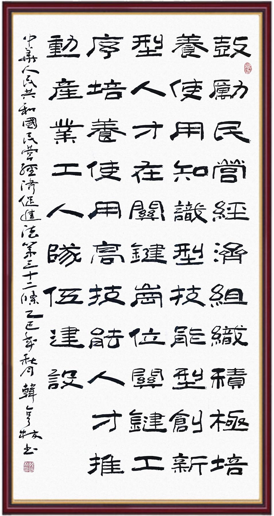 《中華人民共和國(guó)民營(yíng)經(jīng)濟(jì)促進(jìn)法》自今年5月20日起施行。作為我國(guó)首部專門關(guān)于民營(yíng)經(jīng)濟(jì)發(fā)展的基礎(chǔ)性法律,民營(yíng)經(jīng)濟(jì)促進(jìn)法將支持和保障民營(yíng)經(jīng)濟(jì)發(fā)展的法律制度融入中國(guó)特色社會(huì)主義法律體系,具有重大的法治意義,為促進(jìn)民營(yíng)經(jīng)濟(jì)持續(xù)、健康、高質(zhì)量發(fā)展提供了堅(jiān)實(shí)的法治保障。為更好地學(xué)習(xí)、宣傳、貫徹這部法律,法治日?qǐng)?bào)社聯(lián)合司法部普法與依法治理局,開展“‘書·法’系列活動(dòng)之書寫《中華人民共和國(guó)民營(yíng)經(jīng)濟(jì)促進(jìn)法》”活動(dòng)。