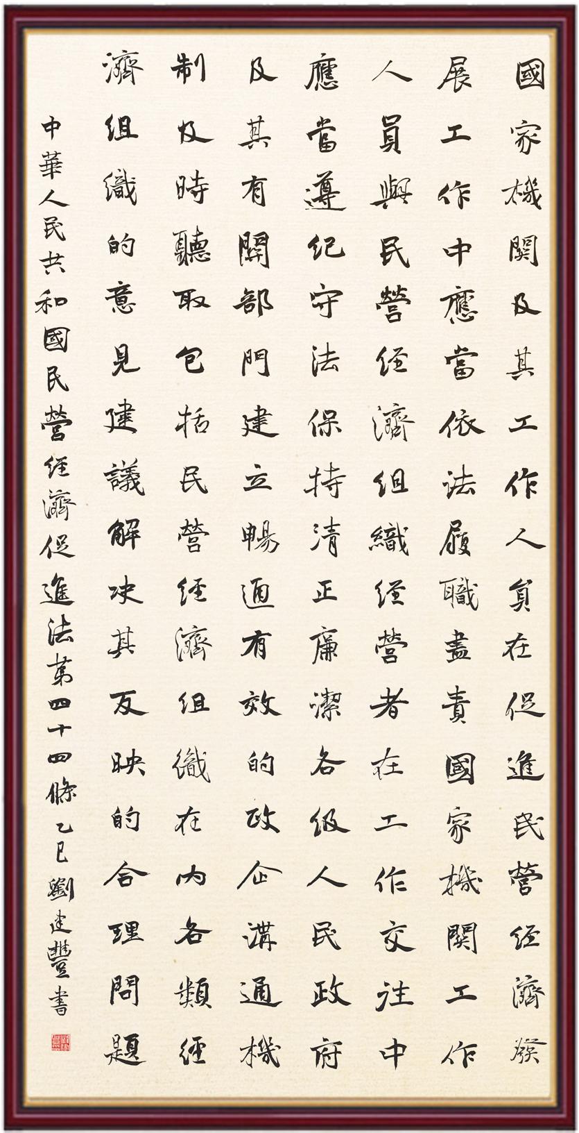 《中華人民共和國民營經(jīng)濟(jì)促進(jìn)法》自今年5月20日起施行。作為我國首部專門關(guān)于民營經(jīng)濟(jì)發(fā)展的基礎(chǔ)性法律,民營經(jīng)濟(jì)促進(jìn)法將支持和保障民營經(jīng)濟(jì)發(fā)展的法律制度融入中國特色社會主義法律體系,具有重大的法治意義,為促進(jìn)民營經(jīng)濟(jì)持續(xù)、健康、高質(zhì)量發(fā)展提供了堅(jiān)實(shí)的法治保障。為更好地學(xué)習(xí)、宣傳、貫徹這部法律,法治日報(bào)社聯(lián)合司法部普法與依法治理局,開展“‘書·法’系列活動之書寫《中華人民共和國民營經(jīng)濟(jì)促進(jìn)法》”活動。