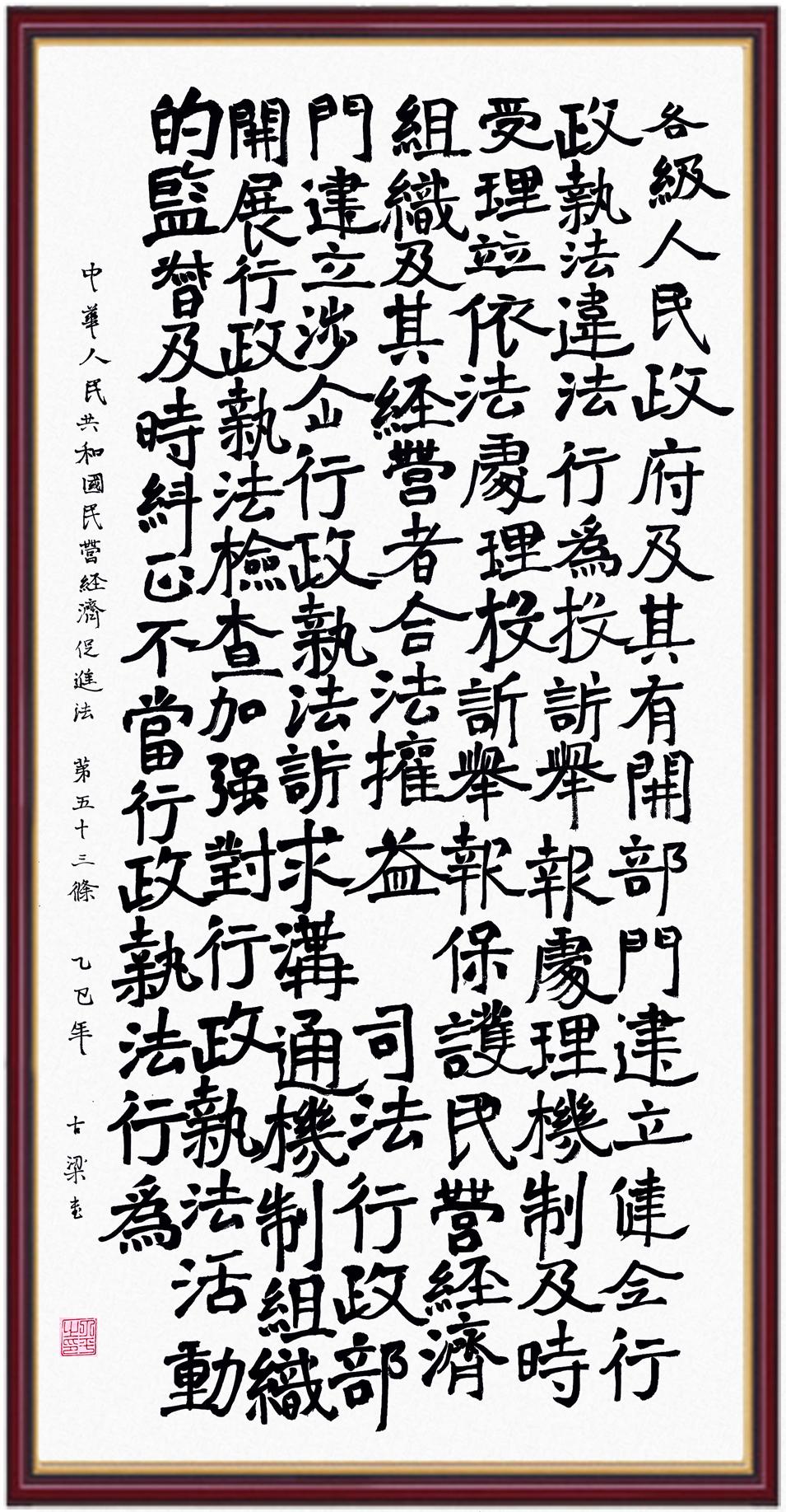 《中華人民共和國民營經(jīng)濟(jì)促進(jìn)法》自今年5月20日起施行。作為我國首部專門關(guān)于民營經(jīng)濟(jì)發(fā)展的基礎(chǔ)性法律,民營經(jīng)濟(jì)促進(jìn)法將支持和保障民營經(jīng)濟(jì)發(fā)展的法律制度融入中國特色社會(huì)主義法律體系,具有重大的法治意義,為促進(jìn)民營經(jīng)濟(jì)持續(xù)、健康、高質(zhì)量發(fā)展提供了堅(jiān)實(shí)的法治保障。為更好地學(xué)習(xí)、宣傳、貫徹這部法律,法治日報(bào)社聯(lián)合司法部普法與依法治理局,開展“‘書·法’系列活動(dòng)之書寫《中華人民共和國民營經(jīng)濟(jì)促進(jìn)法》”活動(dòng)。
