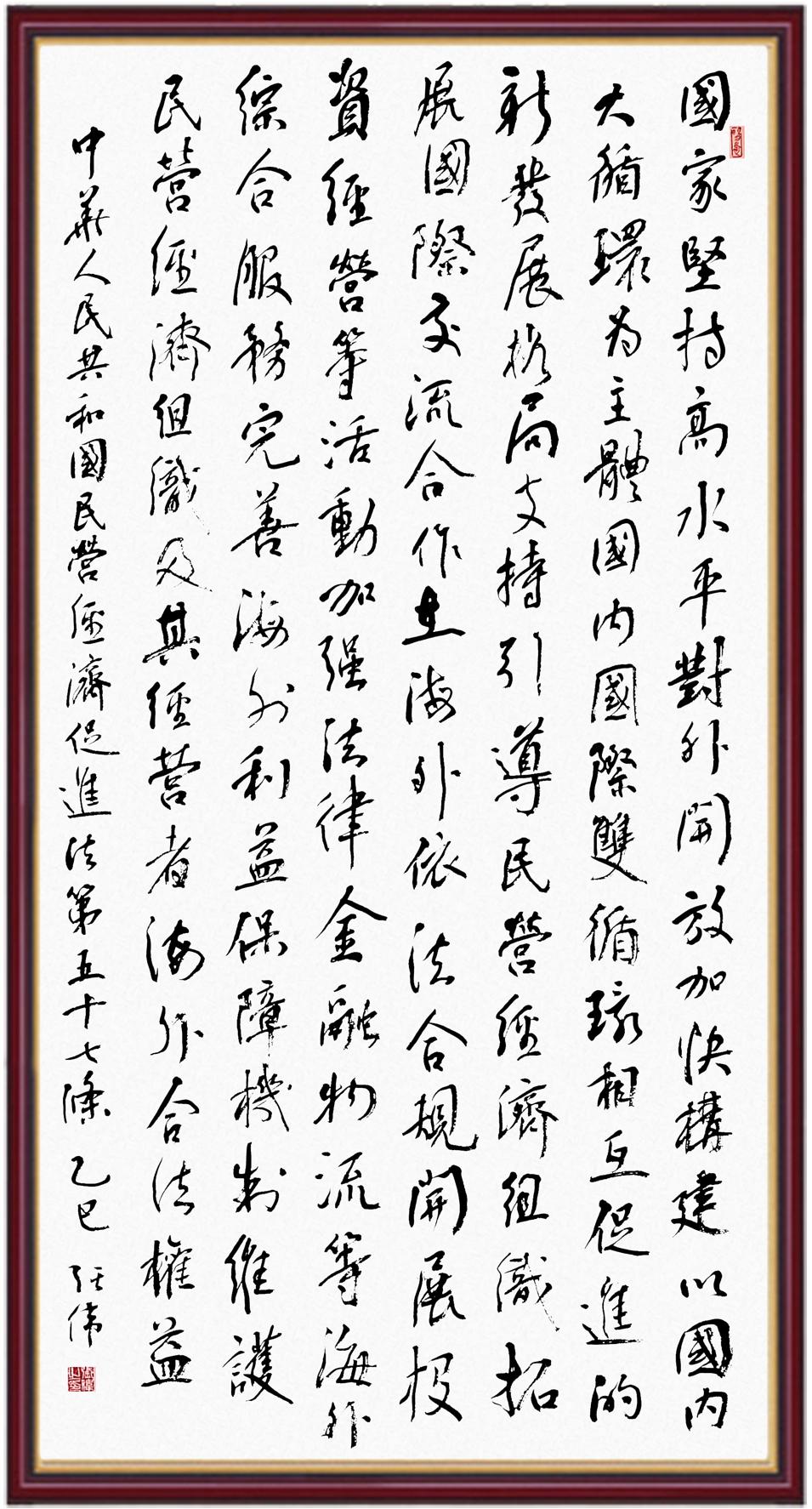 《中華人民共和國民營經(jīng)濟(jì)促進(jìn)法》自今年5月20日起施行。作為我國首部專門關(guān)于民營經(jīng)濟(jì)發(fā)展的基礎(chǔ)性法律,民營經(jīng)濟(jì)促進(jìn)法將支持和保障民營經(jīng)濟(jì)發(fā)展的法律制度融入中國特色社會(huì)主義法律體系,具有重大的法治意義,為促進(jìn)民營經(jīng)濟(jì)持續(xù)、健康、高質(zhì)量發(fā)展提供了堅(jiān)實(shí)的法治保障。為更好地學(xué)習(xí)、宣傳、貫徹這部法律,法治日?qǐng)?bào)社聯(lián)合司法部普法與依法治理局,開展“‘書·法’系列活動(dòng)之書寫《中華人民共和國民營經(jīng)濟(jì)促進(jìn)法》”活動(dòng)。