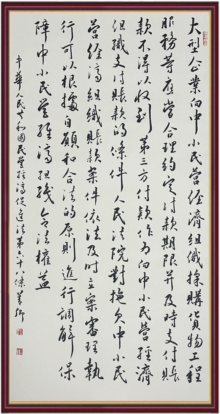 《中華人民共和國民營經(jīng)濟(jì)促進(jìn)法》自今年5月20日起施行。作為我國首部專門關(guān)于民營經(jīng)濟(jì)發(fā)展的基礎(chǔ)性法律,民營經(jīng)濟(jì)促進(jìn)法將支持和保障民營經(jīng)濟(jì)發(fā)展的法律制度融入中國特色社會主義法律體系,具有重大的法治意義,為促進(jìn)民營經(jīng)濟(jì)持續(xù)、健康、高質(zhì)量發(fā)展提供了堅實的法治保障。為更好地學(xué)習(xí)、宣傳、貫徹這部法律,法治日報社聯(lián)合司法部普法與依法治理局,開展“‘書·法’系列活動之書寫《中華人民共和國民營經(jīng)濟(jì)促進(jìn)法》”活動。
