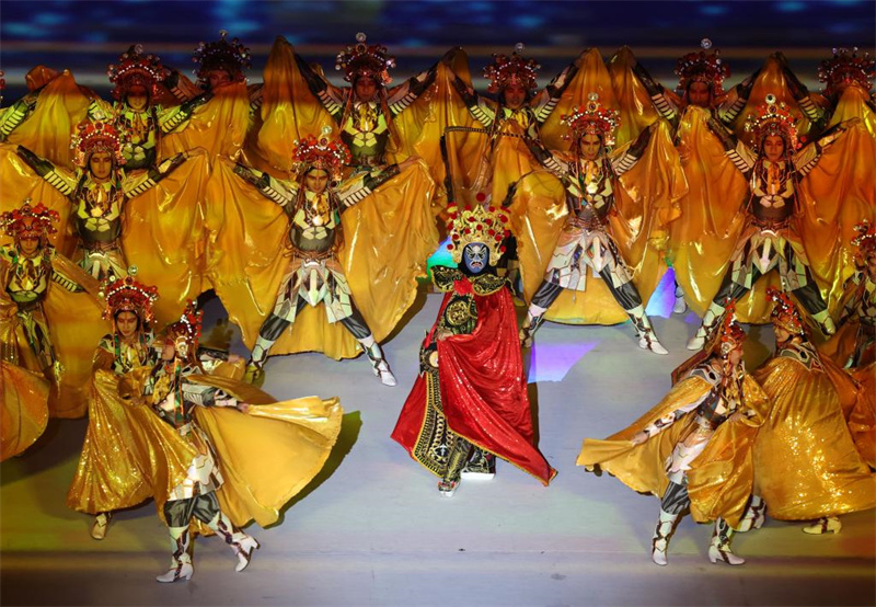 7月28日,演員在大運(yùn)會(huì)開(kāi)幕式上表演川劇變臉。新華社記者江宏景攝