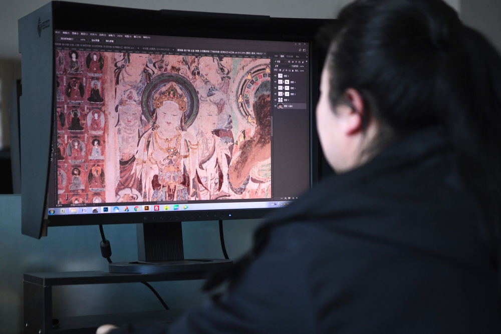 敦煌研究院文物數(shù)字化保護(hù)團(tuán)隊(duì)圖像處理人員年海麗在拼接壁畫(huà)圖像(2023年4月25日攝)。數(shù)字化探索為莫高窟的保護(hù)與傳承開(kāi)辟了全新路徑,數(shù)字技術(shù)讓敦煌文物走出洞窟,跨出國(guó)門(mén),走向“永久保存、永續(xù)利用”。新華社記者 陳斌 攝