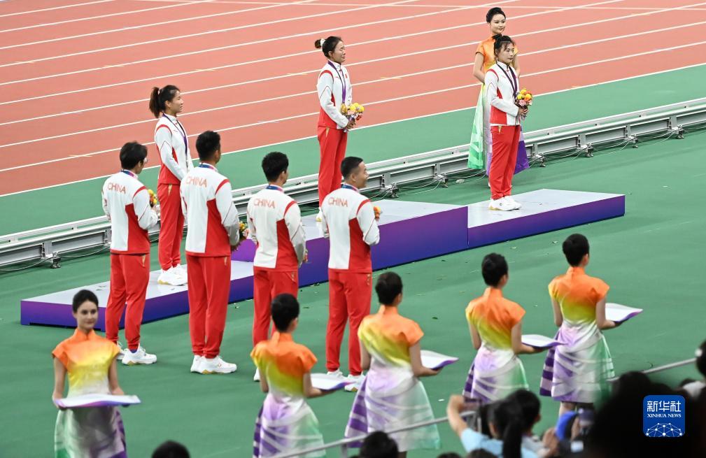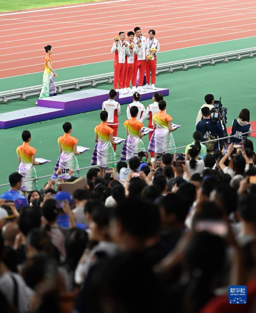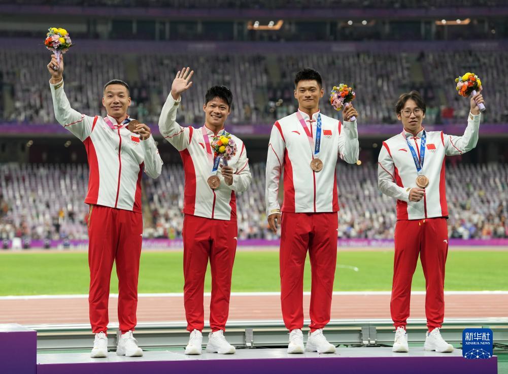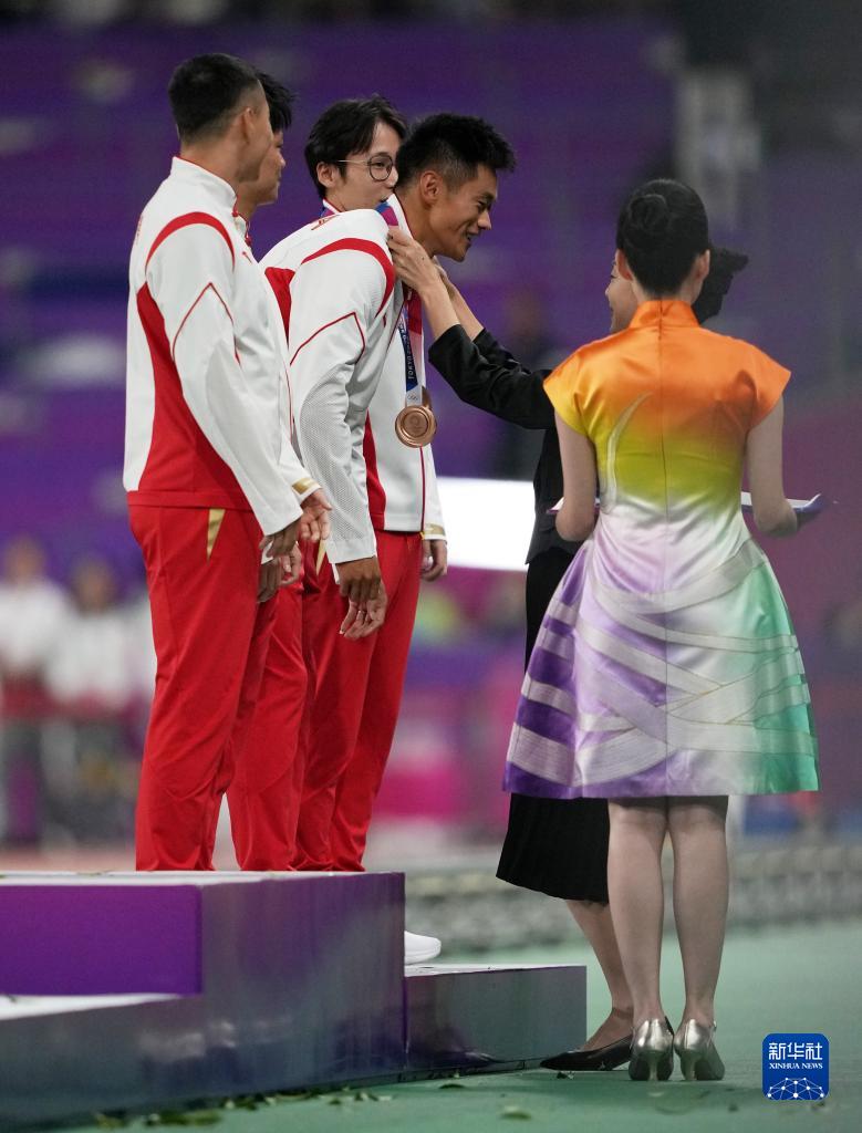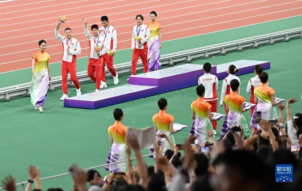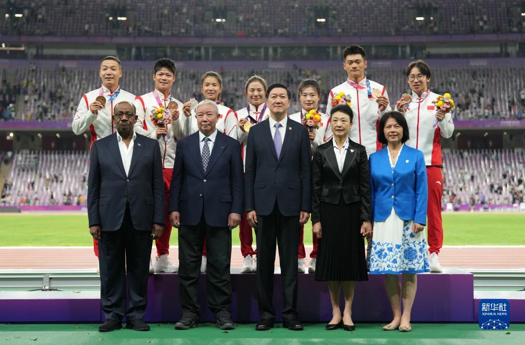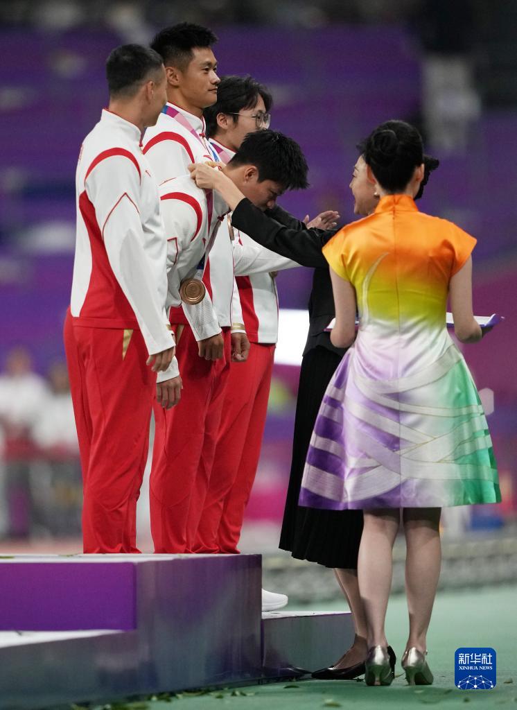 當(dāng)晚,杭州亞運(yùn)會(huì)田徑項(xiàng)目比賽結(jié)束后,中國(guó)奧委會(huì)在杭州奧體中心體育場(chǎng)舉行遞補(bǔ)奧運(yùn)獎(jiǎng)牌頒獎(jiǎng)儀式,為遞補(bǔ)獲得東京奧運(yùn)會(huì)男子4X100米接力銅牌的蘇炳添、謝震業(yè)、吳智強(qiáng)和湯星強(qiáng)與遞補(bǔ)獲得2012年倫敦奧運(yùn)會(huì)女子20公里競(jìng)走金、銀、銅牌的切陽(yáng)什姐、劉虹、呂秀芝頒發(fā)獎(jiǎng)牌。
