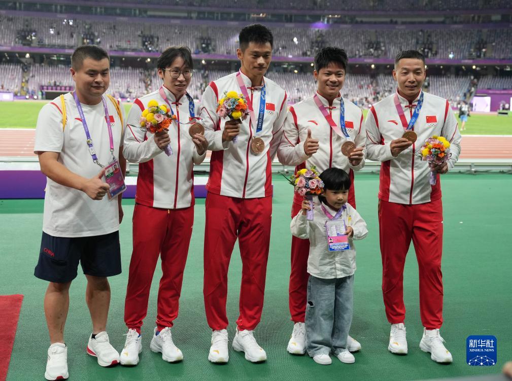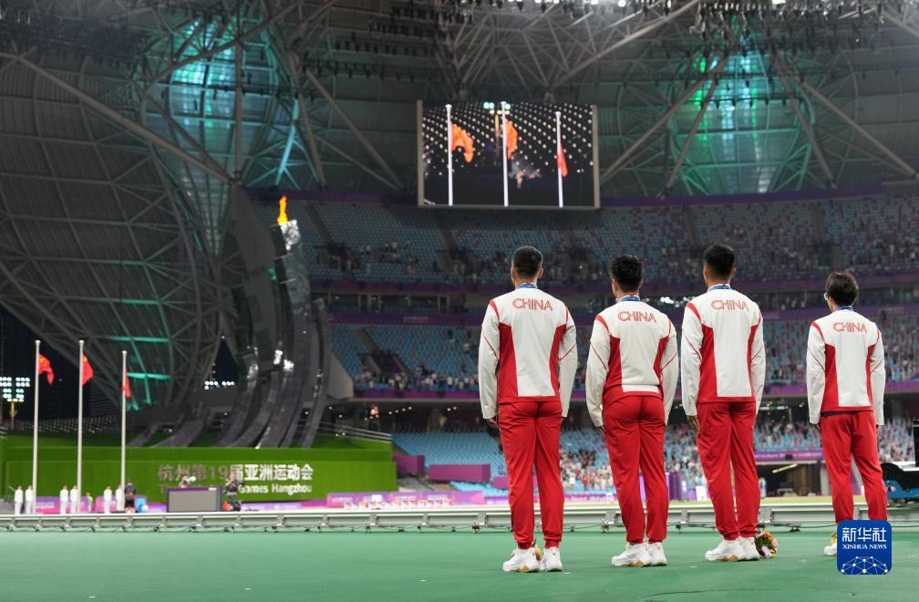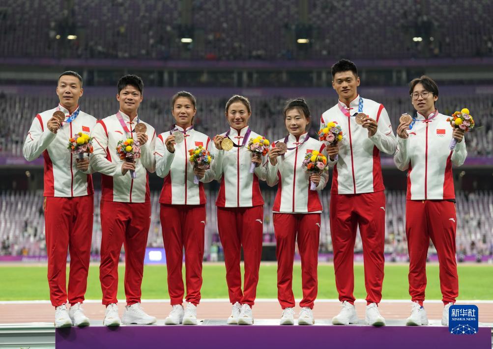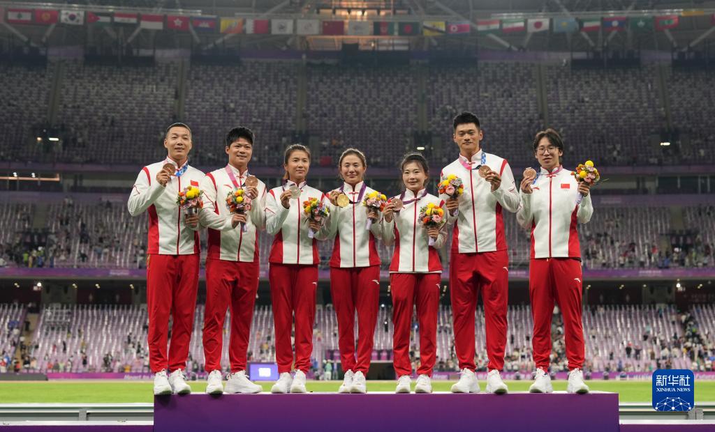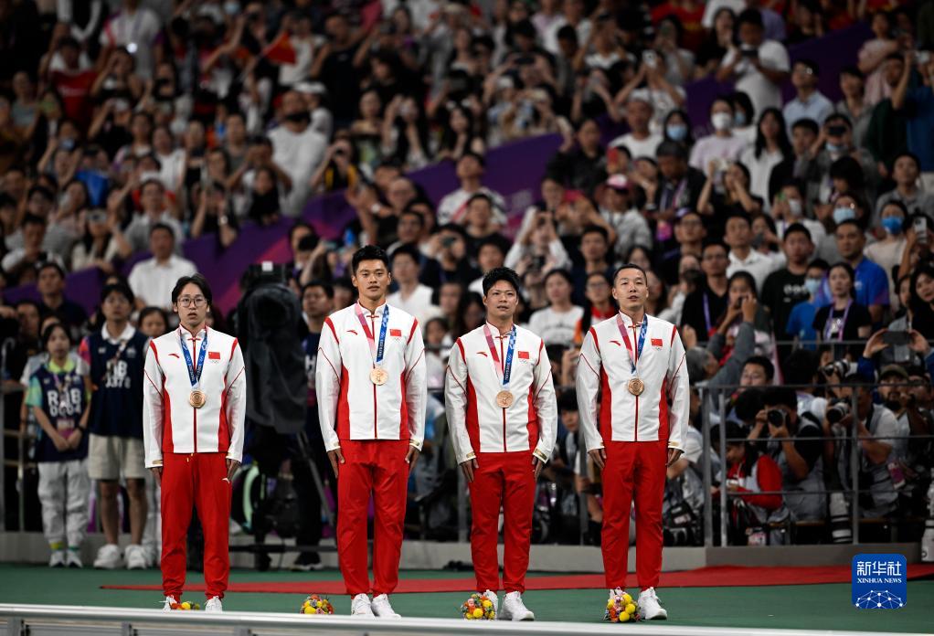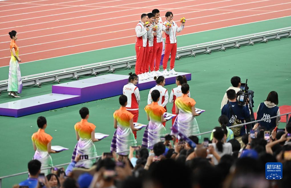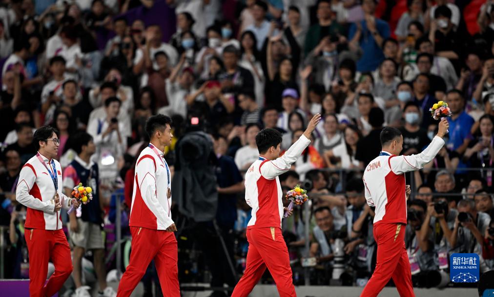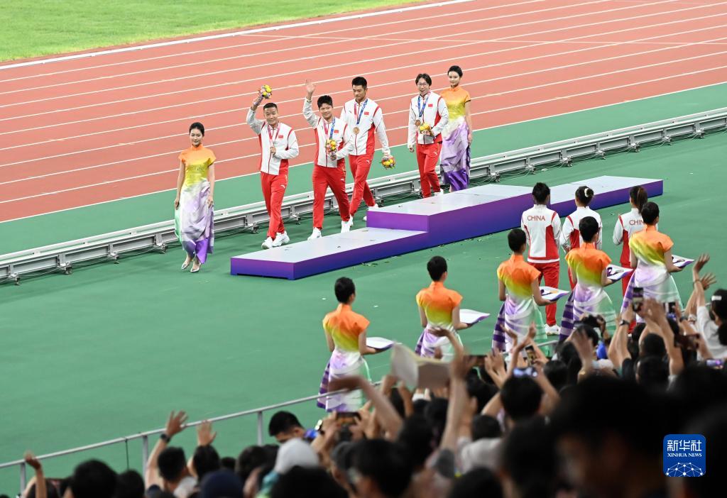 當(dāng)晚,杭州亞運(yùn)會(huì)田徑項(xiàng)目比賽結(jié)束后,中國(guó)奧委會(huì)在杭州奧體中心體育場(chǎng)舉行遞補(bǔ)奧運(yùn)獎(jiǎng)牌頒獎(jiǎng)儀式,為遞補(bǔ)獲得東京奧運(yùn)會(huì)男子4X100米接力銅牌的蘇炳添、謝震業(yè)、吳智強(qiáng)和湯星強(qiáng)與遞補(bǔ)獲得2012年倫敦奧運(yùn)會(huì)女子20公里競(jìng)走金、銀、銅牌的切陽(yáng)什姐、劉虹、呂秀芝頒發(fā)獎(jiǎng)牌。