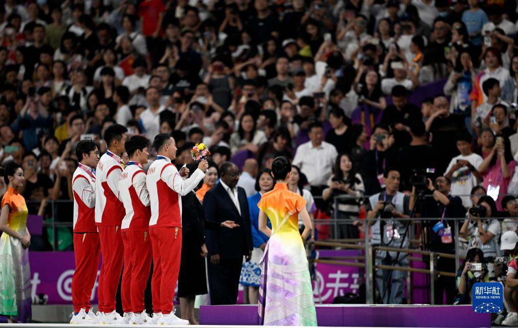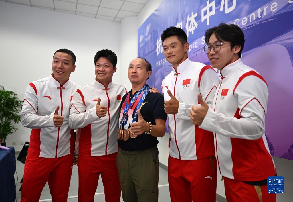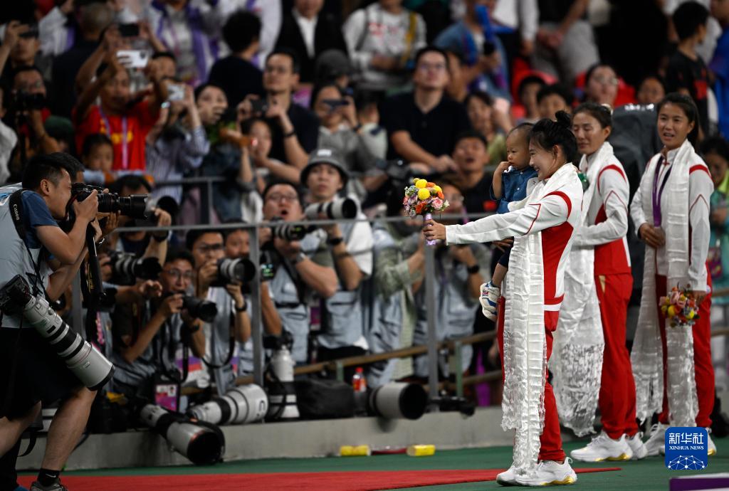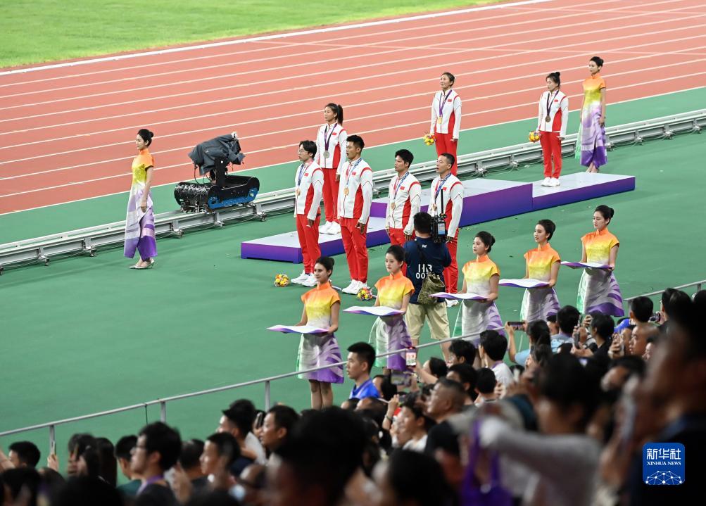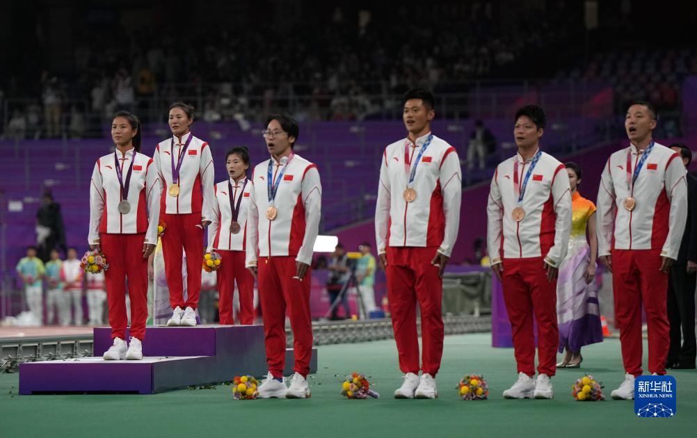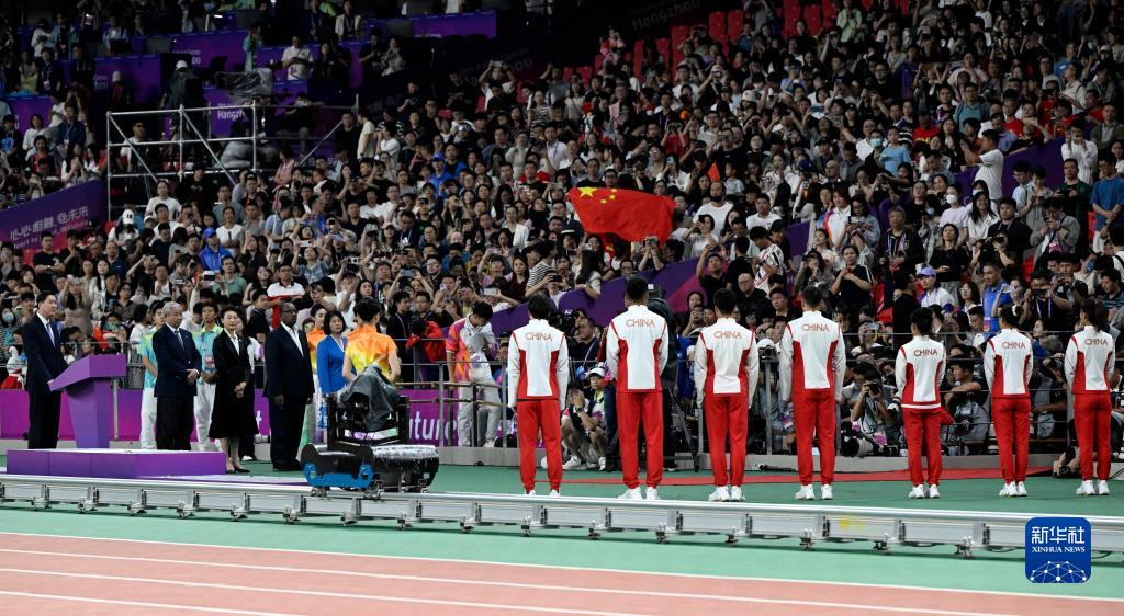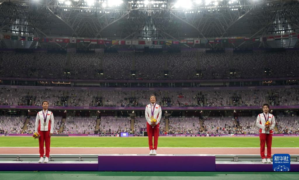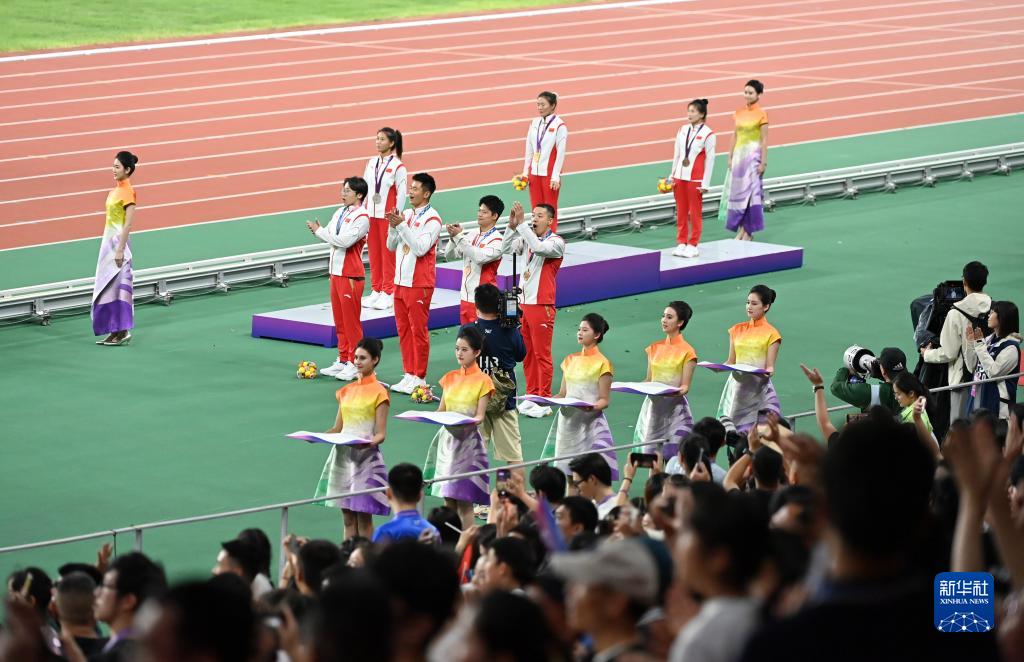 當(dāng)晚,杭州亞運(yùn)會(huì)田徑項(xiàng)目比賽結(jié)束后,中國(guó)奧委會(huì)在杭州奧體中心體育場(chǎng)舉行遞補(bǔ)奧運(yùn)獎(jiǎng)牌頒獎(jiǎng)儀式,為遞補(bǔ)獲得東京奧運(yùn)會(huì)男子4X100米接力銅牌的蘇炳添、謝震業(yè)、吳智強(qiáng)和湯星強(qiáng)與遞補(bǔ)獲得2012年倫敦奧運(yùn)會(huì)女子20公里競(jìng)走金、銀、銅牌的切陽(yáng)什姐、劉虹、呂秀芝頒發(fā)獎(jiǎng)牌。