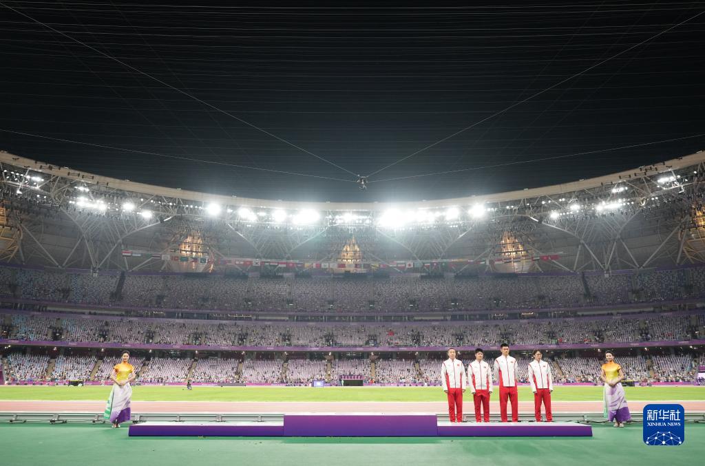 10月4日,湯星強(qiáng)、謝震業(yè)、蘇炳添、吳智強(qiáng)(頒獎(jiǎng)臺(tái)上從右至左)在頒獎(jiǎng)儀式上。