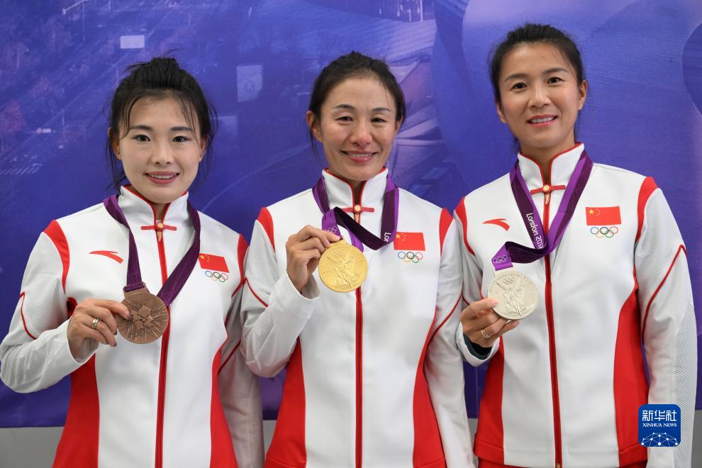 這是切陽(yáng)什姐、劉虹、呂秀芝遞補(bǔ)獲得的2012年倫敦奧運(yùn)會(huì)女子20公里競(jìng)走金、銀、銅牌(10月4日攝)。