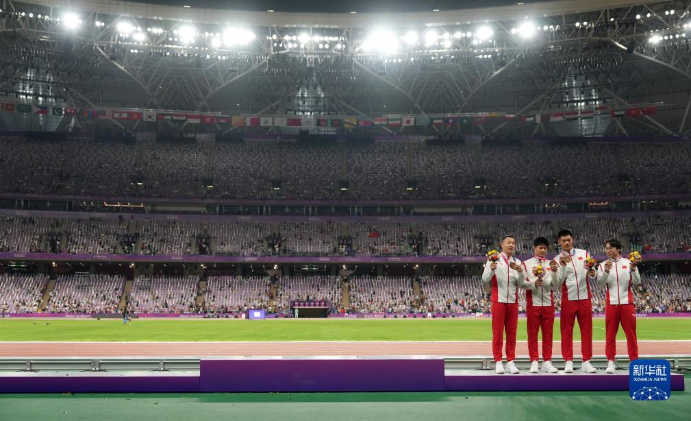10月4日,湯星強(qiáng)、謝震業(yè)、蘇炳添、吳智強(qiáng)(從右至左)在頒獎(jiǎng)儀式后展示獎(jiǎng)牌。