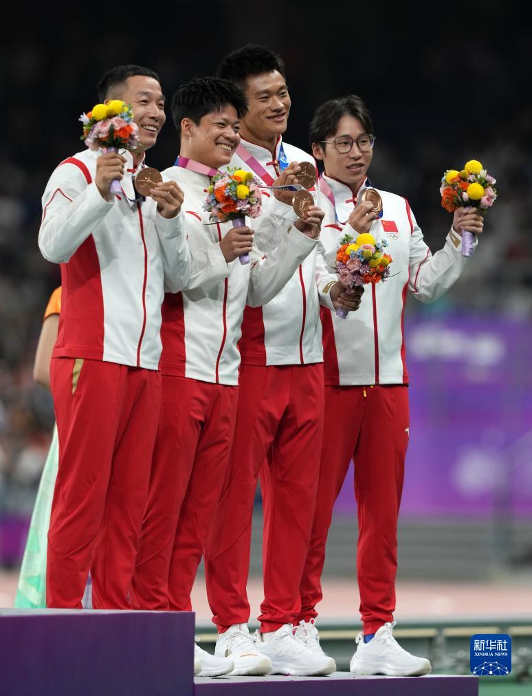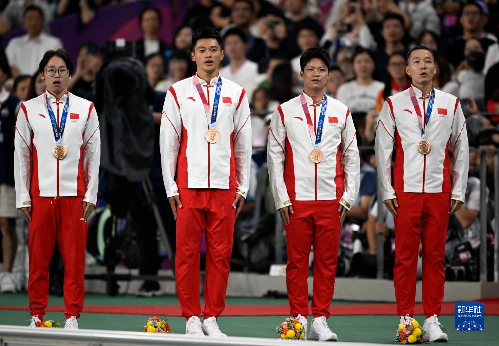 這是湯星強(qiáng)、謝震業(yè)、蘇炳添、吳智強(qiáng)遞補(bǔ)獲得的東京奧運(yùn)會(huì)男子4X100米接力銅牌(10月4日攝)。