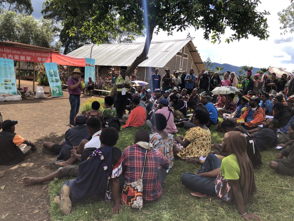 中國專家在巴布亞新幾內(nèi)亞東高地省中國援助巴新菌草和旱稻技術(shù)項(xiàng)目第9期培訓(xùn)班上授課(2020年12月15日攝)。新華社發(fā)