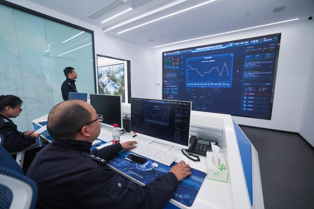 在位于浙江湖州的喬溇生態(tài)警務(wù)聯(lián)勤共治工作站里,值班民警通過智能化監(jiān)控平臺(tái)對(duì)太湖水質(zhì)環(huán)境進(jìn)行實(shí)時(shí)監(jiān)測(cè)。新華社記者徐昱 攝