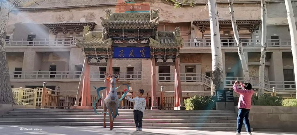置身莫高窟,拿出手機(jī),身披絲帶的九色鹿竟從壁畫中“飛身而下”。摸摸它,乖巧的小鹿還會輕扭身體,與人互動。人、實(shí)體洞窟和虛擬畫面三者同時(shí)出現(xiàn)在鏡頭里,常令游客倍感新奇。