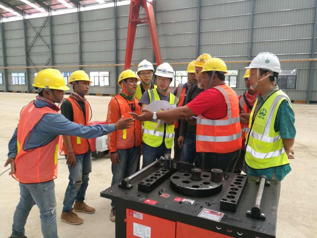 2017年,鈕彥鑫(左五)在鋼筋加工廠指導(dǎo)第一批進(jìn)場工人。(受訪者供圖)