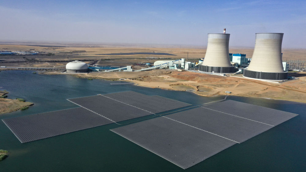國家能源集團(tuán)寧夏電力公司寧東電廠3×5.98兆瓦漂浮分布式光伏發(fā)電項(xiàng)目全景(無人機(jī)照片,2022年6月17日攝)。新華社記者 王鵬 攝