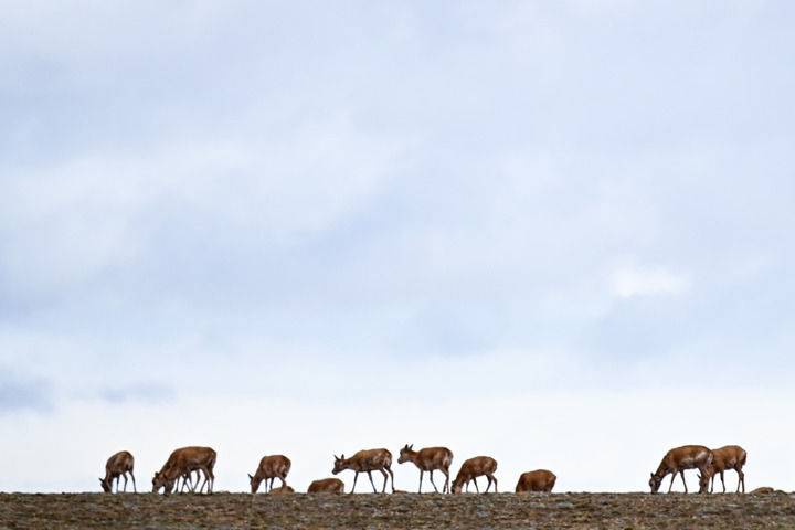 藏羚羊在青??煽晌骼镂宓懒旱貐^(qū)遷徙(2024年5月27日攝)。新華社記者 張龍 攝