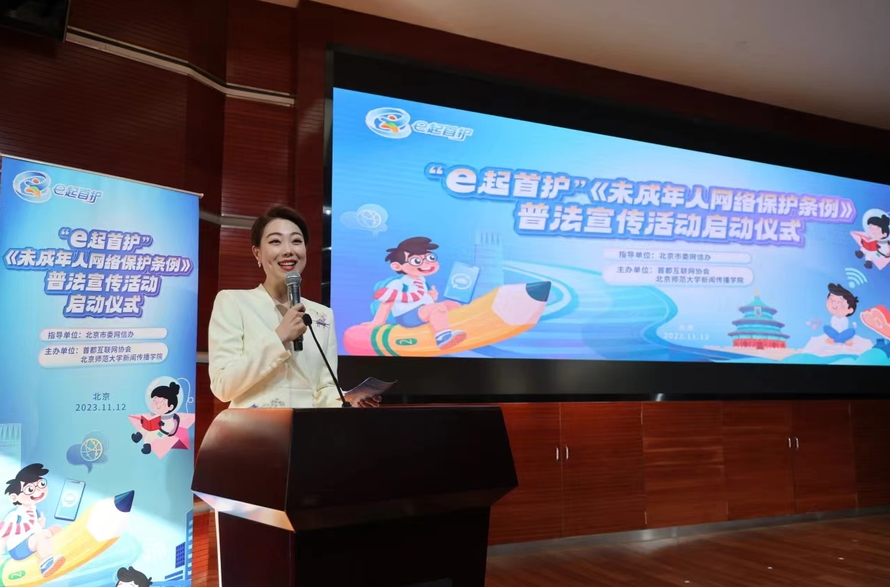 2023年11月12日,由北京市委網(wǎng)信辦指導(dǎo)、首都互聯(lián)網(wǎng)協(xié)會(huì)和北京師范大學(xué)新聞傳播學(xué)院主辦的“e起首護(hù)”《未成年人網(wǎng)絡(luò)保護(hù)條例》普法宣傳活動(dòng)啟動(dòng)儀式在北京師范大學(xué)舉行,這標(biāo)志著“e起首護(hù)”《未成年人網(wǎng)絡(luò)保護(hù)條例》(以下簡(jiǎn)稱《條例》)系列普法活動(dòng)正式拉開帷幕。中央網(wǎng)信辦網(wǎng)絡(luò)法治局副局長(zhǎng)、一級(jí)巡視員侯云灝,北京市委網(wǎng)信辦副主任李德剛,北京師范大學(xué)校務(wù)委員會(huì)副主任陳光巨參加活動(dòng)儀式并致辭。北京市委宣傳部、市高級(jí)人民法院、市人民檢察院、市教委、共青團(tuán)北京市委和各區(qū)委網(wǎng)信辦等相關(guān)負(fù)責(zé)同志,屬地重點(diǎn)互聯(lián)網(wǎng)企業(yè)、北京師范大學(xué)師生代表及社會(huì)各界人士200余人參加。