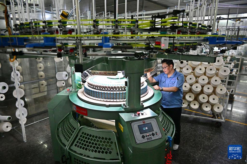 ??即墨區(qū)一家智慧紡紗企業(yè)的技術(shù)人員在維護(hù)生產(chǎn)高檔布料的自動化圓機(3月25日攝)。