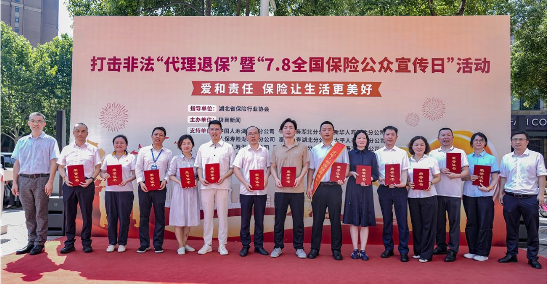 活動(dòng)現(xiàn)場(chǎng),大家人壽湖北分公司代表與12家金融機(jī)構(gòu)代表聯(lián)合發(fā)起倡議,鄭重宣讀《打擊非法代理退保承諾書》,展現(xiàn)行業(yè)堅(jiān)決打擊非法“代理退保”黑灰產(chǎn)的決心。國(guó)家金融監(jiān)督管理總局湖北監(jiān)管局、湖北省保險(xiǎn)行業(yè)協(xié)會(huì)和極目新聞相關(guān)領(lǐng)導(dǎo)共同為現(xiàn)場(chǎng)保險(xiǎn)公司頒發(fā)“打擊非法‘代理退保’先鋒單位”榮譽(yù)證書,倡議行業(yè)助力保險(xiǎn)消費(fèi)者守護(hù)好“錢袋子”。