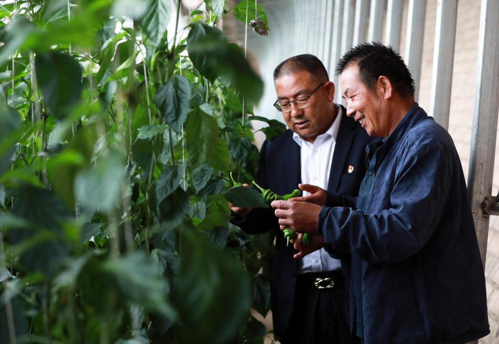 在富民新村種植區(qū)的日光溫室內(nèi),富民新村黨委書記兼村委會(huì)主任張延堂(左)在與種植戶何振田查看辣椒長(zhǎng)勢(shì)。新華社記者 郭剛 攝