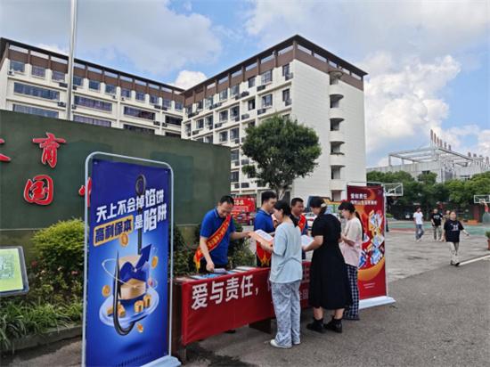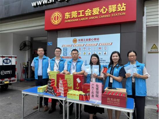 在東莞市匯峰中心,前海人壽東莞分公司的志愿者搭建起服務(wù)站點,為環(huán)衛(wèi)工人、快遞員、外賣員等戶外工作者送上清涼飲品,同時結(jié)合宣傳材料講解電信詐騙手法和防范要點,在送上夏日關(guān)懷的同時有效提升群眾金融風險防范意識。