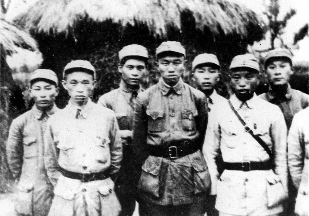 這是1939年初,新四軍第一支隊二團部分干部在茅山的合影。左起第五位為蕭國生(資料照片)。新華社發(fā)