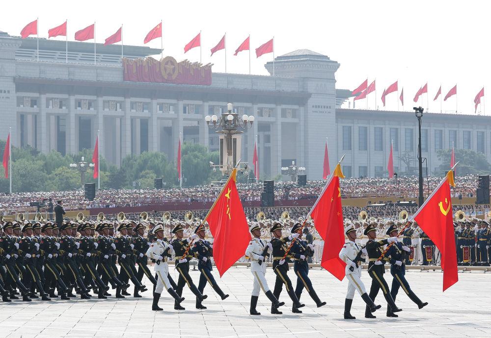 激昂的號(hào)角聲響徹廣場(chǎng),習(xí)近平主席乘檢閱車來(lái)到長(zhǎng)安街上,在受閱部隊(duì)最前方向黨旗、國(guó)旗、軍旗行注目禮。