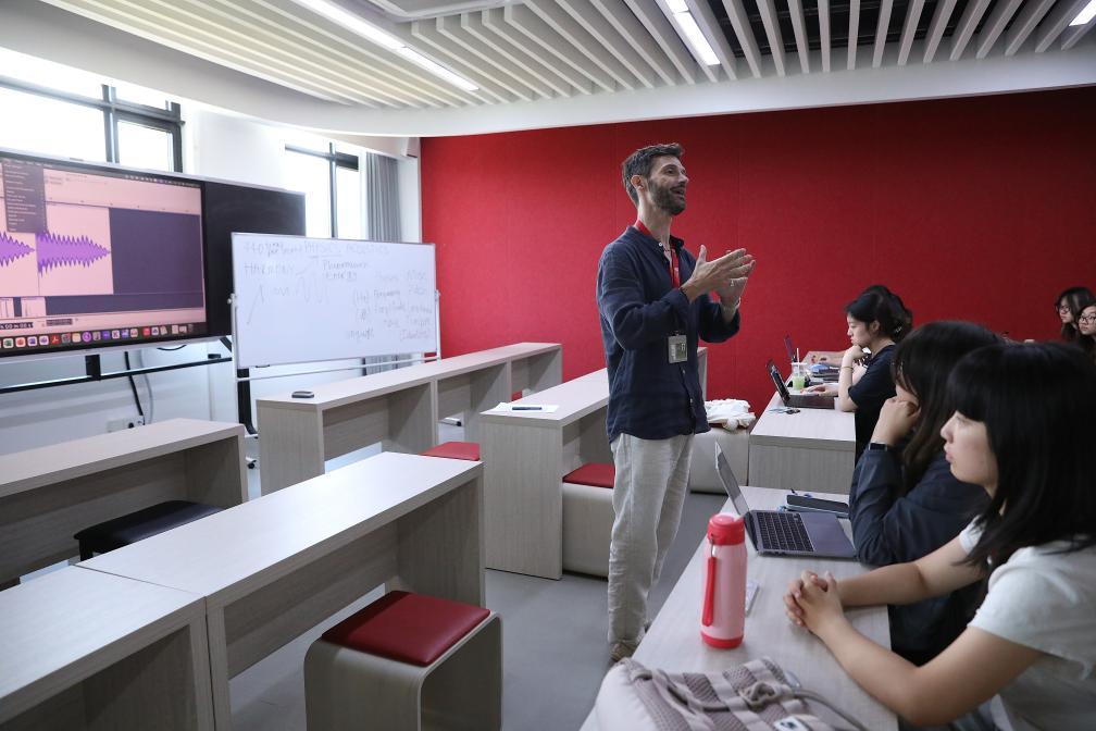 9月25日,海南陵水黎安國際教育創(chuàng)新試驗區(qū)中央民族大學(xué)海南國際學(xué)院的外籍教師在給學(xué)生上音樂技術(shù)與作曲課。新華社記者 鄭悅 攝