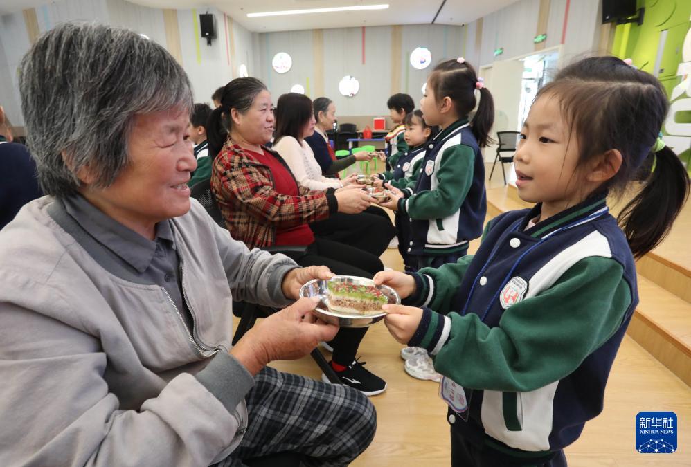 10月27日,在江蘇省蘇州市姑蘇區(qū)平潤實驗幼兒園,小朋友為長輩送上重陽糕。