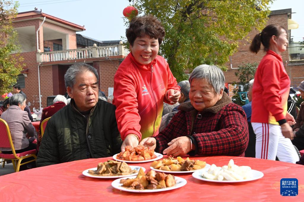 10月27日,在河南省沁陽市西萬鎮(zhèn)留莊村舉辦的“九九重陽節(jié),濃濃敬老情”迎重陽主題活動中,志愿者為老人擺上“長壽宴”菜品。