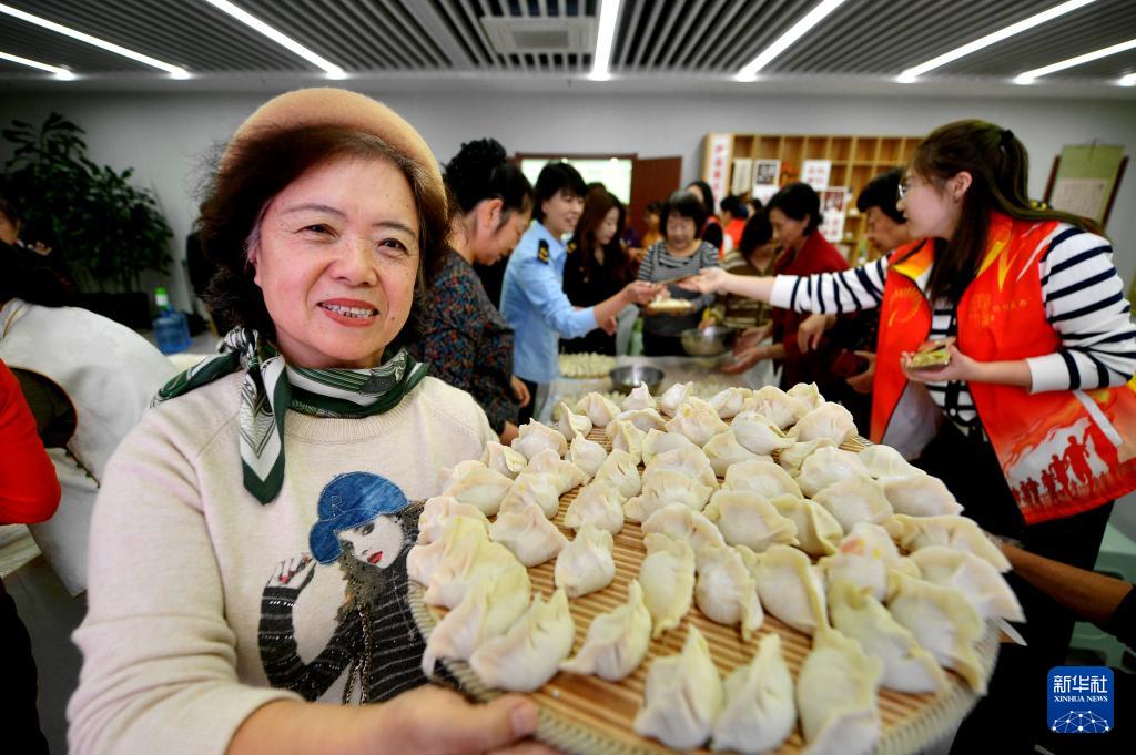 10月27日,在青島市嶗山區(qū)金家?guī)X街道魯信長(zhǎng)春社區(qū)開展的迎重陽敬老活動(dòng)上,老人展示包的餃子。