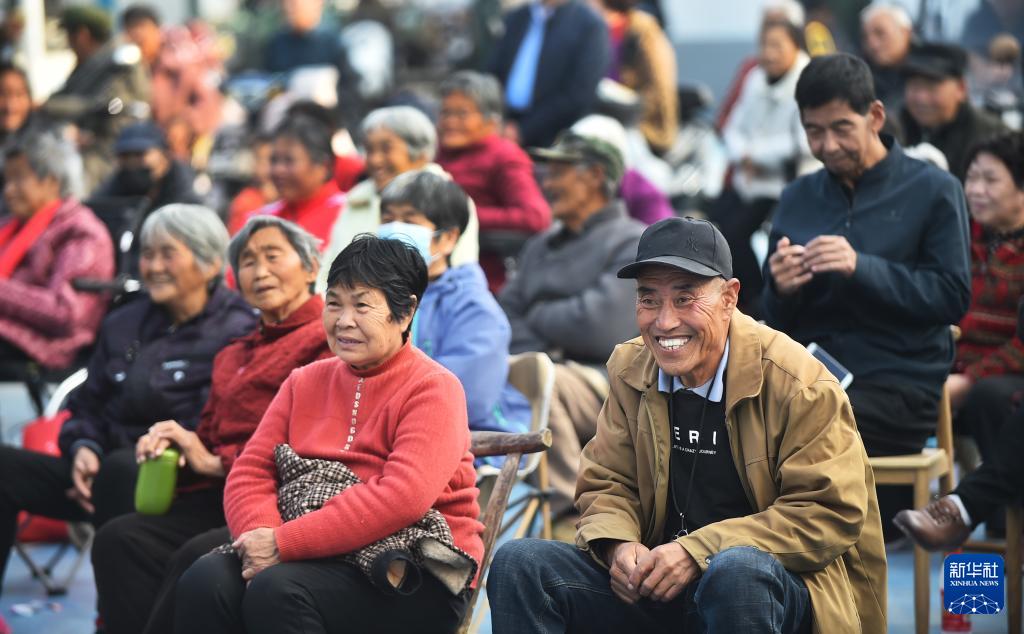 10月26日,老人們在河南省洛陽市澗西區(qū)工農(nóng)街道大所社區(qū)文化廣場舉行的重陽節(jié)公益演出活動上欣賞豫劇節(jié)目。