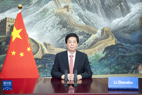6月27日,全國(guó)人大常委會(huì)委員長(zhǎng)栗戰(zhàn)書應(yīng)邀在泰國(guó)國(guó)會(huì)成立90周年慶?;顒?dòng)上發(fā)表視頻致辭。新華社記者?李濤?攝