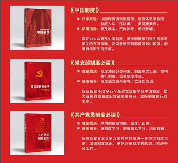 李鐵教授的制度學系列叢書分為法制篇——《中國政治制度》《中國經(jīng)濟制度》《中國文化制度》《中國社會制度》《中國生態(tài)文明制度》《黨內法規(guī)制度》《中國軍事制度》《中國法治制度》《中國農(nóng)業(yè)制度》《中國科技制度》,自信篇——《5000年制度歷程》《中國制度》《黨支部制度必讀》《共產(chǎn)黨員制度必讀》《中國科舉制度》《中國文官制度》《中國法律制度》《中國行政制度》《把權利關進制度的籠子》,創(chuàng)新篇——《中國民法典與中國制度》《百年制度豐碑》等等。