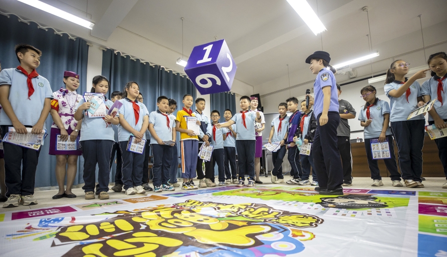 9月11日至17日,2023年國家網(wǎng)絡(luò)安全宣傳周在全國范圍內(nèi)統(tǒng)一開展。成都鐵路公安局重慶公安處組建安全宣傳小分隊(duì)到重慶科學(xué)城含谷中學(xué)校,針對(duì)網(wǎng)絡(luò)安全、電信詐騙、出行安全等,開展宣傳教育活動(dòng)。圖為9月12日,民警組織學(xué)生開展“安全大富翁”互動(dòng)游戲。