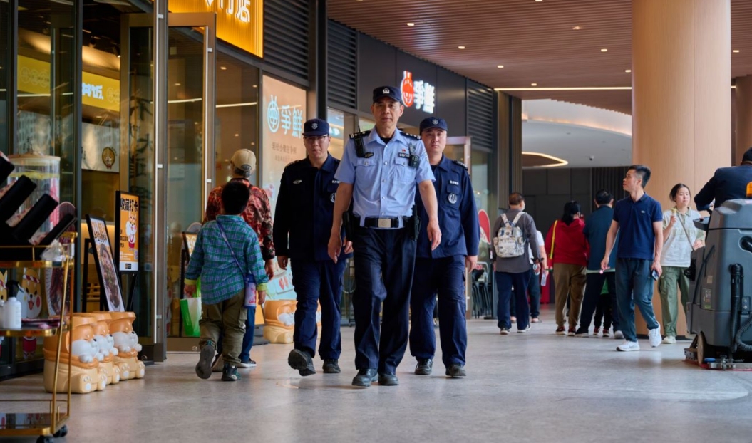 “五一”假期期間,北京市昌平區(qū)超極合生匯日均客流近15萬人,成為昌平警方開展安保工作的重點(diǎn)點(diǎn)位之一。昌平公安分局最大化前置警力,組織屬地派出所與內(nèi)保、治安、交警、特警、消防、群防群治力量聯(lián)勤協(xié)作,確保治安和交通秩序平穩(wěn)。圖為民警在超極合生匯周邊開展巡邏。