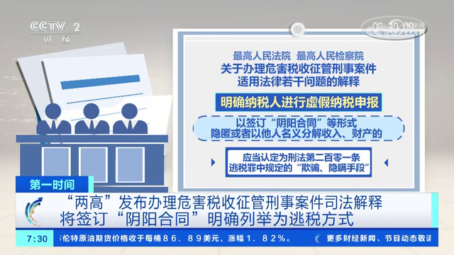 “兩高”發(fā)布辦理危害稅收征管刑事案件司法解釋 將簽訂“陰陽(yáng)合同”明確列舉為逃稅方式