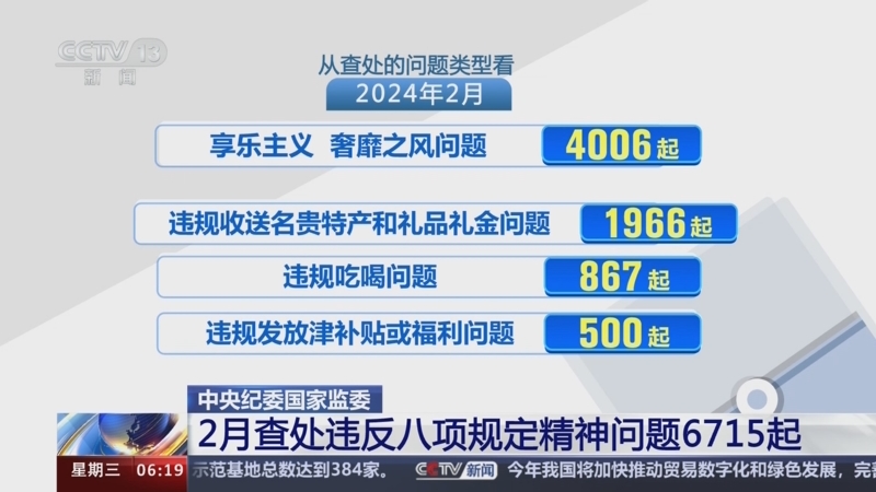 中央紀(jì)委國家監(jiān)委 2月查處違反八項規(guī)定精神問題6715起