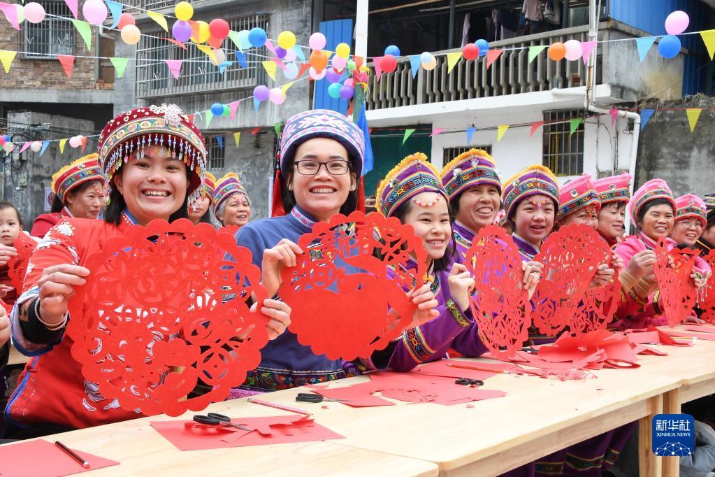 1月16日,在廣西河池市羅城仫佬族自治縣四把鎮(zhèn)思平村小稔屯,民間剪紙藝人展示自己的生肖兔剪紙作品。