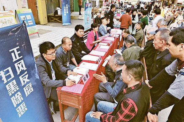 部署開展掃黑除惡專項(xiàng)斗爭,社會治安秩序明顯改善,基層治理成效顯著。圖為在掃黑除惡斗爭中,福建省建甌市接訪工作人員在小橋鎮(zhèn)墟日上接待群眾來訪。新華社記者張國?。瘮z