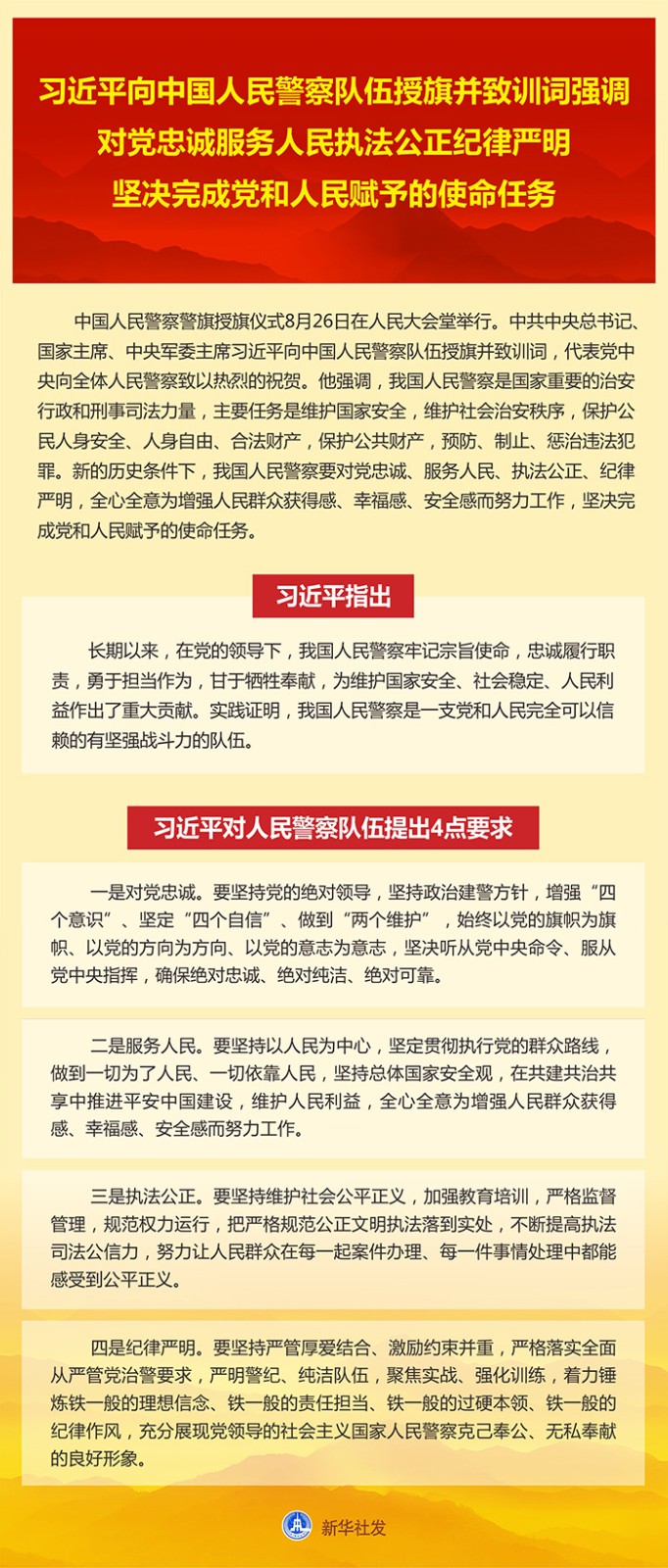 新華社北京8月26日電 中國(guó)人民警察警旗授旗儀式26日在人民大會(huì)堂舉行。中共中央總書記、國(guó)家主席、中央軍委主席習(xí)近平向中國(guó)人民警察隊(duì)伍授旗并致訓(xùn)詞,代表黨中央向全體人民警察致以熱烈的祝賀。他強(qiáng)調(diào),我國(guó)人民警察是國(guó)家重要的治安行政和刑事司法力量,主要任務(wù)是維護(hù)國(guó)家安全,維護(hù)社會(huì)治安秩序,保護(hù)公民人身安全、人身自由、合法財(cái)產(chǎn),保護(hù)公共財(cái)產(chǎn),預(yù)防、制止、懲治違法犯罪。新的歷史條件下,我國(guó)人民警察要對(duì)黨忠誠(chéng)、服務(wù)人民、執(zhí)法公正、紀(jì)律嚴(yán)明,全心全意為增強(qiáng)人民群眾獲得感、幸福感、安全感而努力工作,堅(jiān)決完成黨和人民賦予的使命任務(wù)。