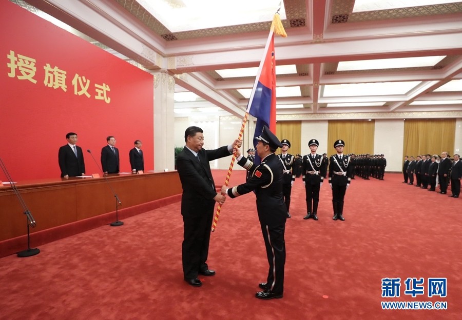 8月26日,中國(guó)人民警察警旗授旗儀式在人民大會(huì)堂舉行。中共中央總書記、國(guó)家主席、中央軍委主席習(xí)近平向中國(guó)人民警察隊(duì)伍授旗并致訓(xùn)詞。這是習(xí)近平向中國(guó)人民警察隊(duì)伍授旗。 新華社記者 鞠鵬 攝