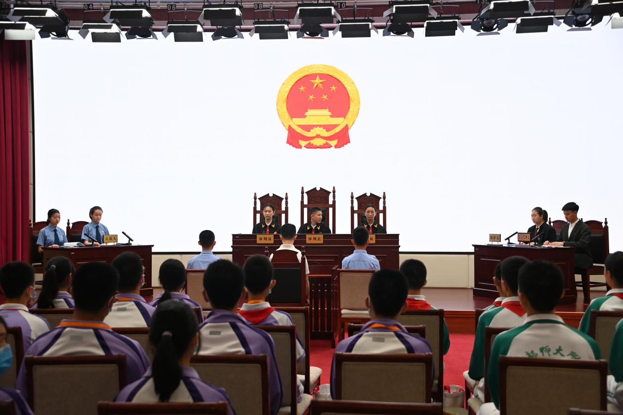 開放日活動(dòng)的最后一個(gè)環(huán)節(jié)是設(shè)立小型模擬法庭,互動(dòng)式體驗(yàn)法治教育。在模擬法庭中,首都師范大學(xué)附屬中學(xué)的學(xué)生周詳森和孫鈺桐分別擔(dān)任審判長和公訴人,他們穿上制服,走進(jìn)法庭,有條不紊、嚴(yán)謹(jǐn)規(guī)范地開啟了“沉浸式”體驗(yàn)。