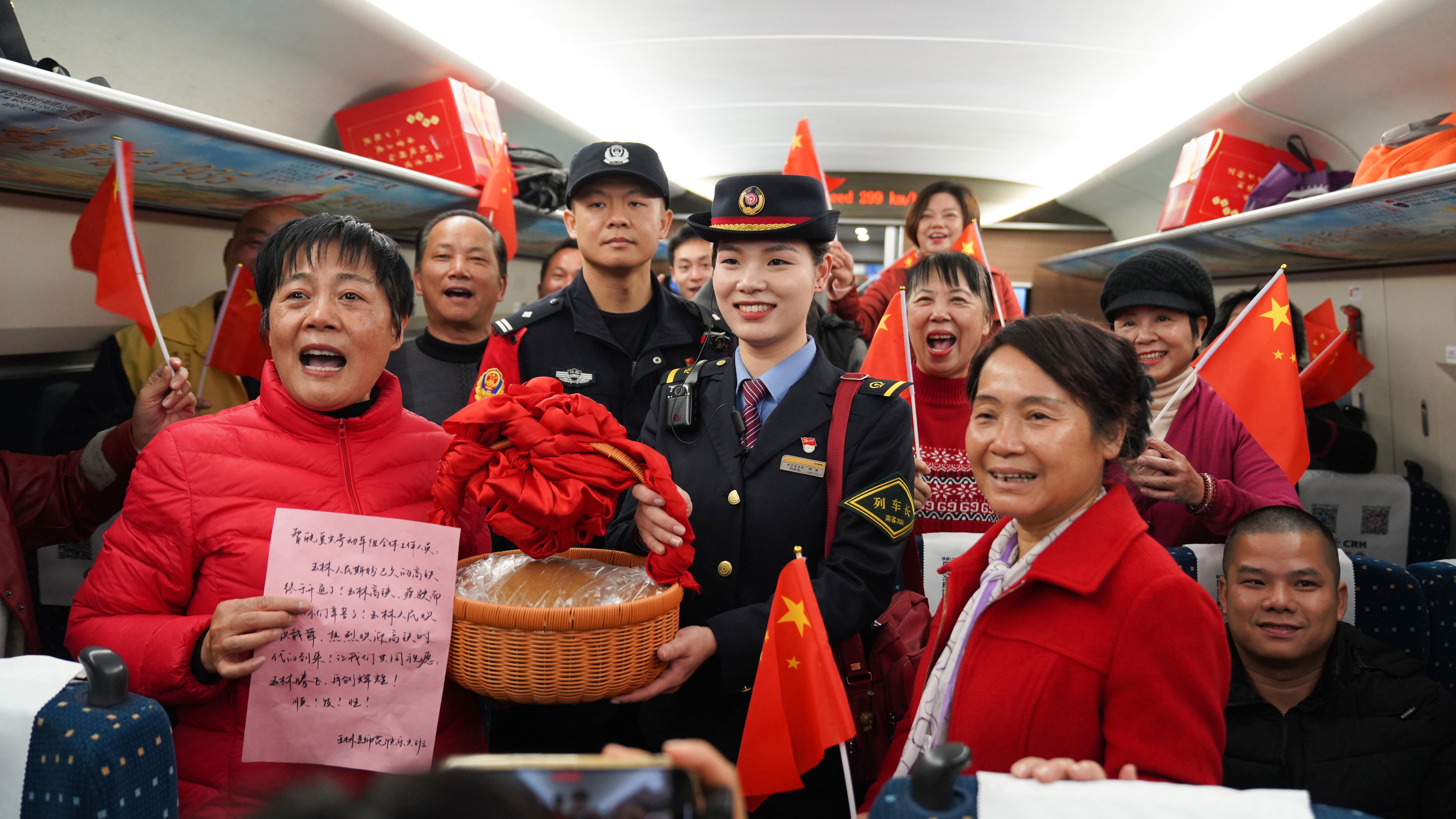 圖為首發(fā)列車(chē)G5514次列車(chē)乘警與旅客在車(chē)廂合影紀(jì)念南珠高鐵開(kāi)通。