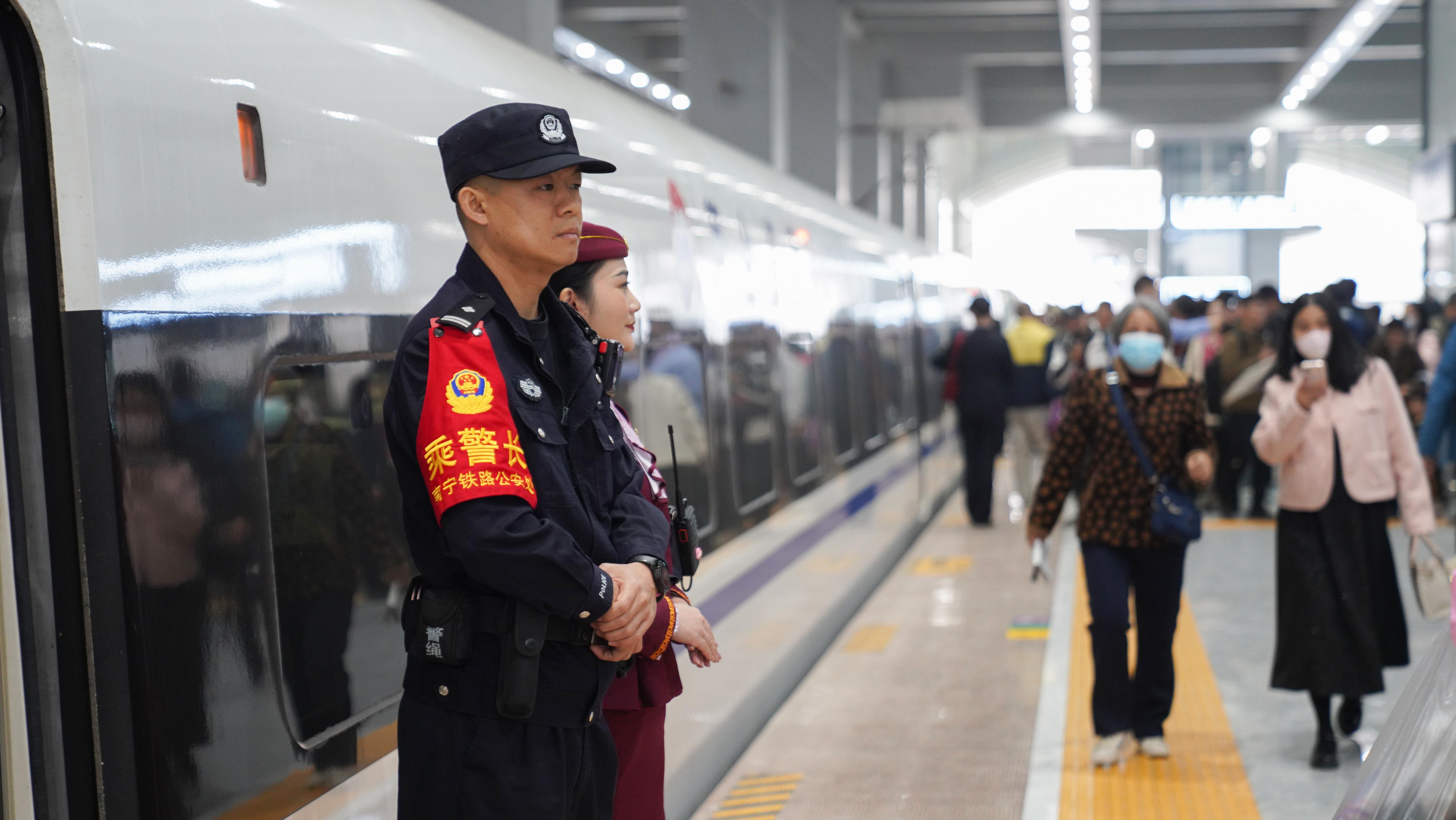 12月30日,南珠高鐵南寧至玉林段開(kāi)通運(yùn)營(yíng)。南寧鐵路公安局南寧公安處民警在南珠高鐵上維護(hù)列車(chē)秩序,保障人民群眾安全,護(hù)航南珠高鐵平安運(yùn)行。