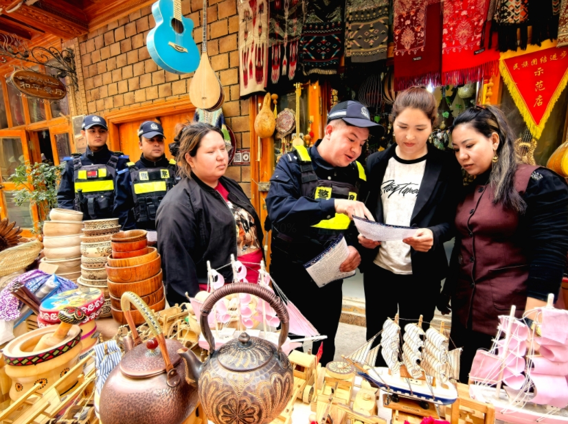 圖為和田市公安局團(tuán)城便民警務(wù)站民輔警在團(tuán)城景區(qū)向游客和景區(qū)商戶開展防范電信網(wǎng)絡(luò)詐騙普法宣傳活動。