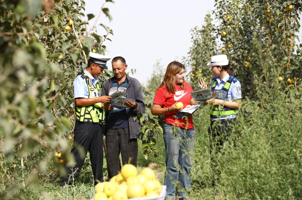 8月12日,新疆喀什地區(qū)葉城縣公安局組織民警深入轄區(qū)梨園,推行“助農(nóng)+普法”工作模式,協(xié)助果農(nóng)采摘果實(shí),并在勞作休息時(shí)間,面對(duì)面開展普法宣傳,用實(shí)際行動(dòng)守護(hù)果農(nóng)的勞動(dòng)成果。