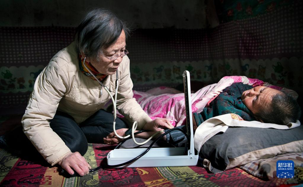 在陜西佳縣店鎮(zhèn)賀家溝村農(nóng)家窯洞里,路生梅(左)跪坐在土炕上為癱瘓不起的村民喬愛芬義診(2021年1月18日攝)。新華社記者 陶明 攝